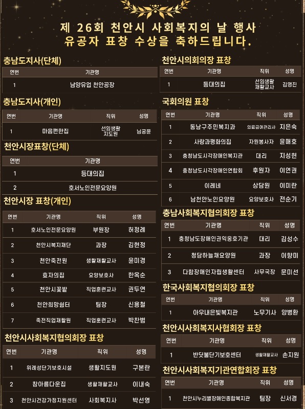 제 26회 천안시사회복지의 날 행사 유공자 표창수상 페이지 정보 작성자작성자 : 천사협 조회조회수 : 468회 작성일작성일 : 25-09-23 13:14 본문 수상을 축하 드립니다! 목록 다음글「제26회 천안시사회복지의 날 행사」사회복지 유공자 추천 협조 요청 25.07.28